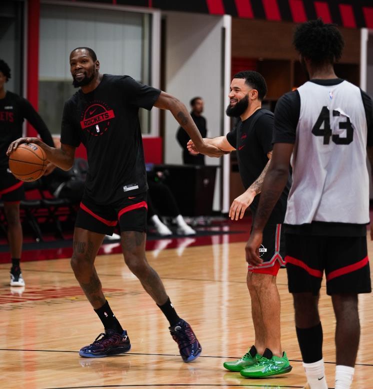 本场比赛火箭队的第二功臣是杜兰特,虽然这位老将24投11中,命中率一般,但他三分球9中4,罚球9中7,全场也轰下了33分,并且摘下了8个篮板,送出2次抢断。